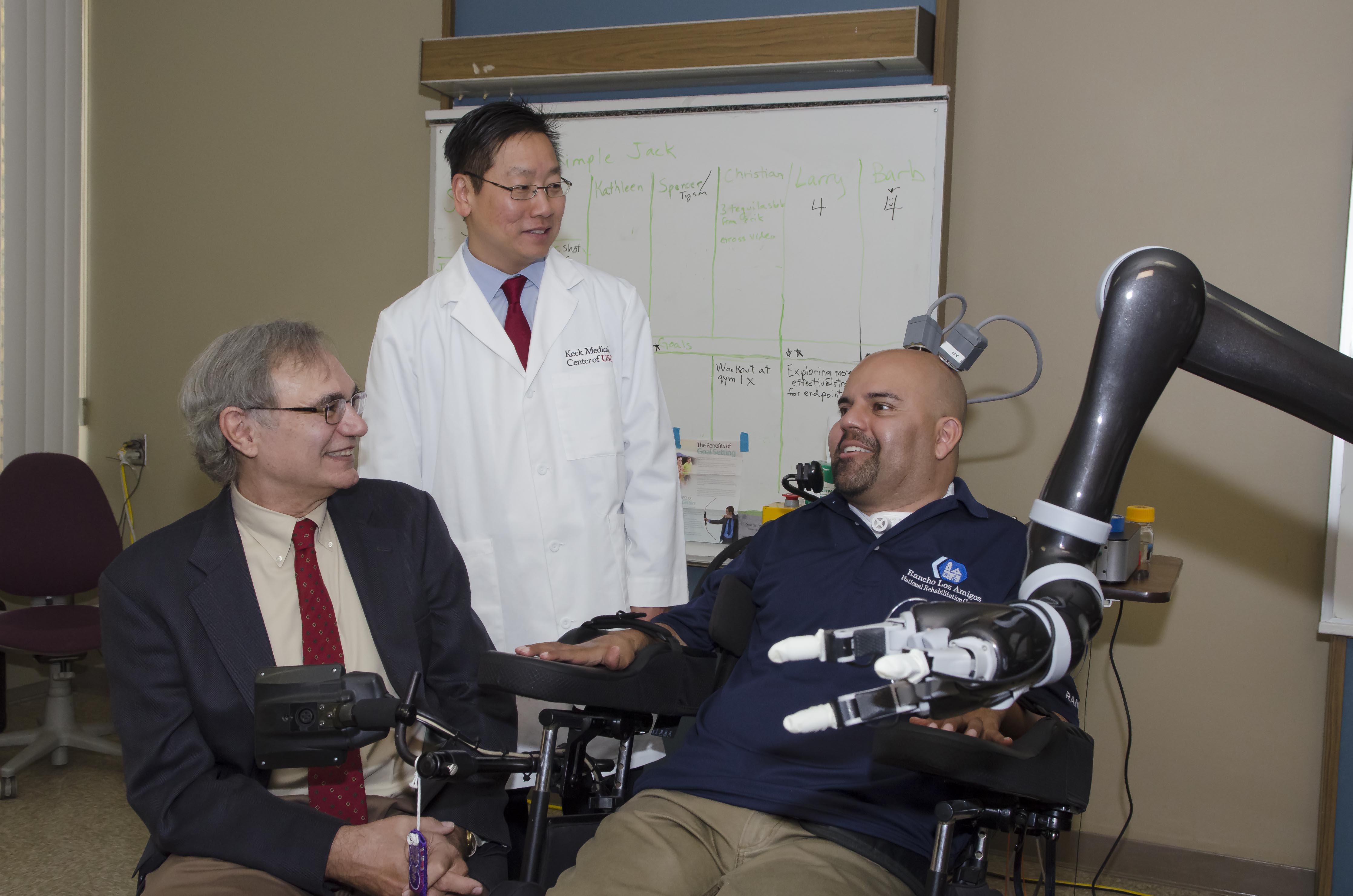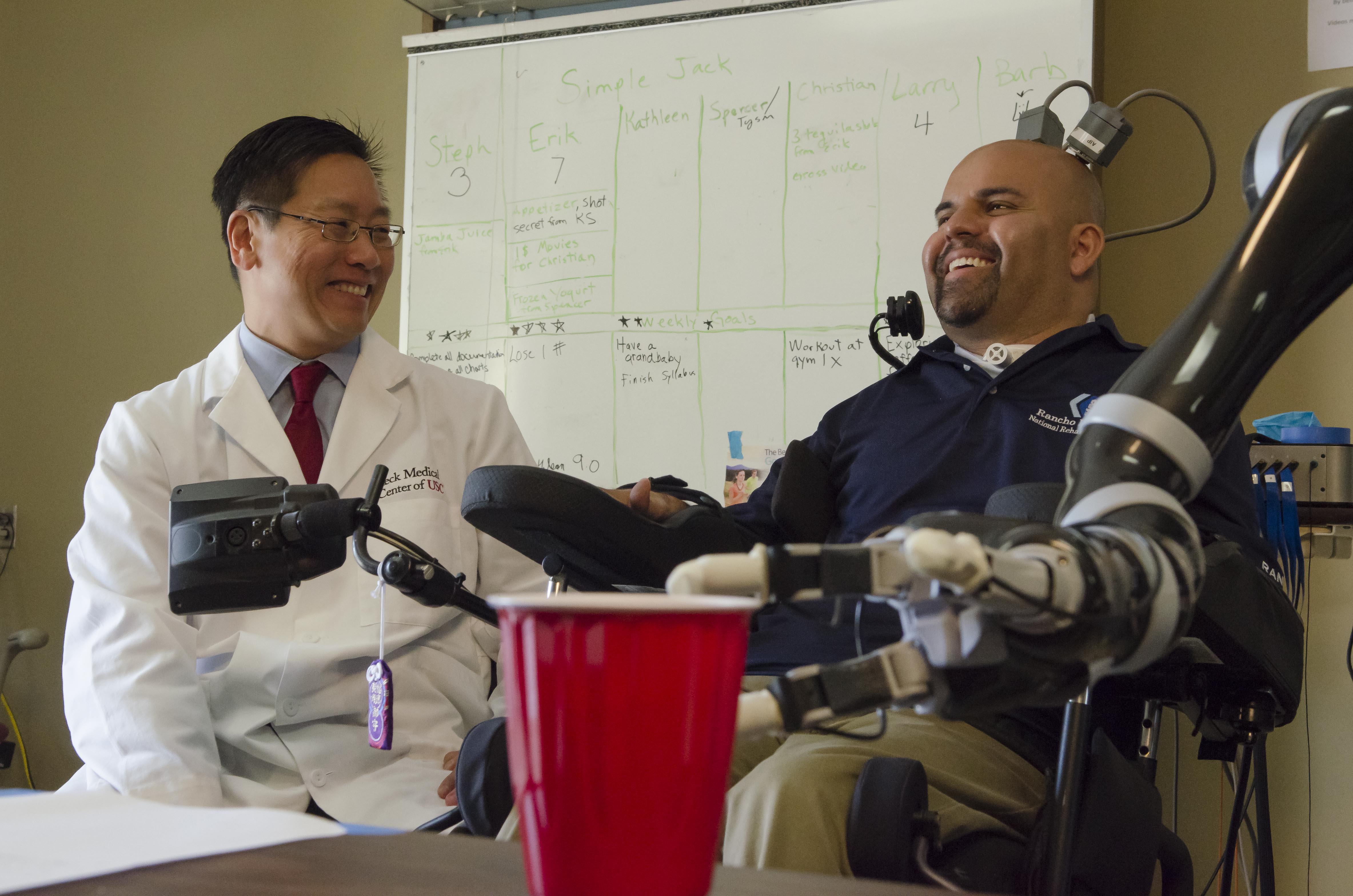 Dr. Charles Y. Liu, professor of neurological surgery, neurology, and biomedical engineering at USC, shares a laugh with patient Erik Sorto. Liu is the director for the USC Neurorestoration Center, and was the lead surgeon for the team that implanted a pair of small electrode arrays in two parts of the posterior parietal context (PPC) of Sorto's brain. Each array contains 96 active electrodes that, in turn, each record the activity of single neurons in the PPC. Liu has focused his career on taking care of patients with neurological injuries and diseases. Liu says, "It is clear that completely new approaches are necessary to restore function to paralyzed patients. Direct brain control of robots and computers has the potential to dramatically change the lives of many people." (Credit: Lance Hayashida, Caltech http://bit.ly/1cONiyz)