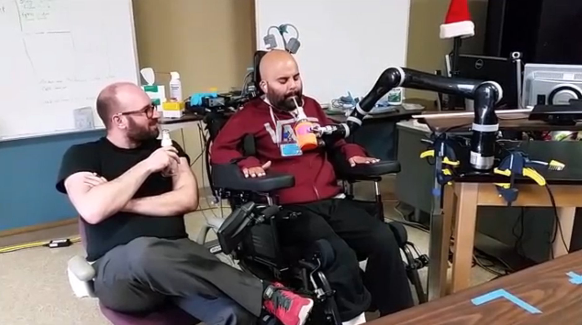 Sharing a beer, without help. Sorto says, "I joke around with the guys that I want to be able to drink my own beer–to be able to take a drink at my own pace, when I want to take a sip out of my beer and to not have to ask somebody to give it to me." (Credit: Caltech, Keck Medicine of USC, Rancho Los Amigos National Rehabilitation Center http://bit.ly/1BcmgqW)