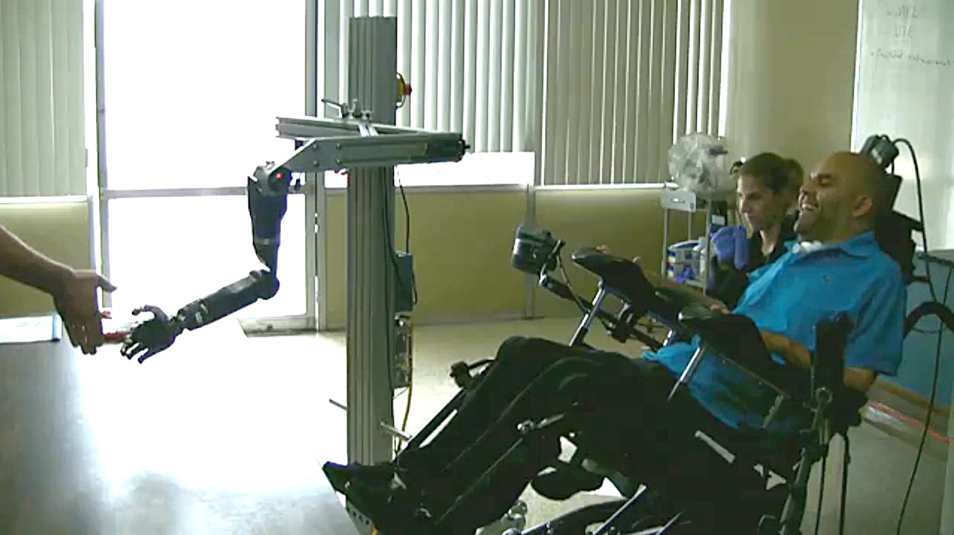 Using a brain-controlled robotic arm to help himself to a drink, Erik Sorto says, "This study has been very meaningful to me. As much as the project needed me, I needed the project. The project has made a huge difference in my life. It gives me great pleasure to be part of the solution for improving paralyzed patients' lives." (Credit: Spencer Kellis and Christian Klaes, Caltech http://bit.ly/1HtFVaj)
