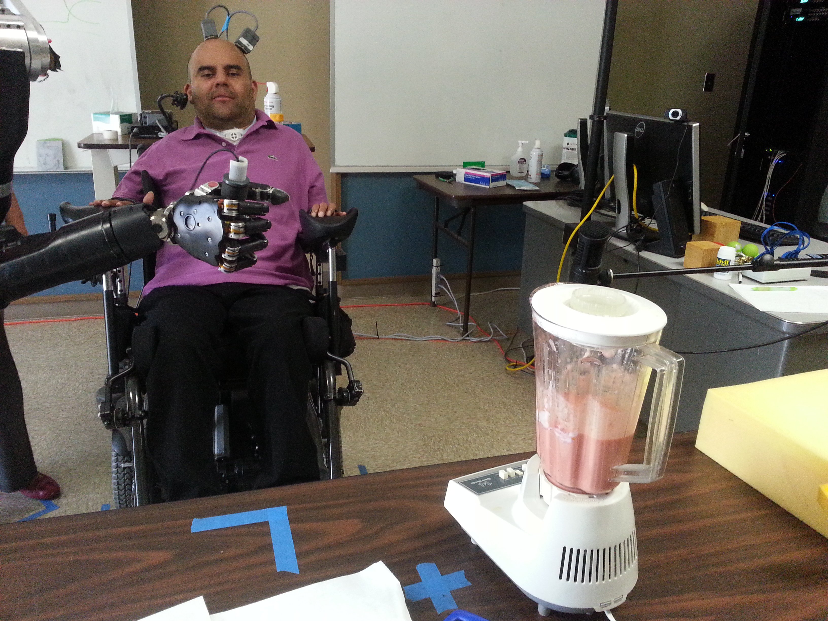 Making a smoothie. Although he was able to immediately move the robot arm with his thoughts, after weeks of imagining, Sorto refined his control of the arm. Now he is able to execute advanced tasks with his mind, such as controlling a blender. (Credit: Spencer Kellis, Caltech http://bit.ly/1c56rM5)