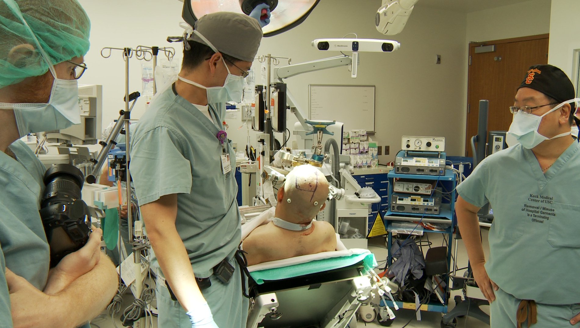 The surgical team at Keck Medicine of USC, working in close collaboration with Caltech and Rancho Los Amigo National Rehabilitation Center, performed the unprecedented neuroprosthetic implant in a five-hour surgery on April 17, 2013. Here the patient, Erik Sorto, is being prepped.